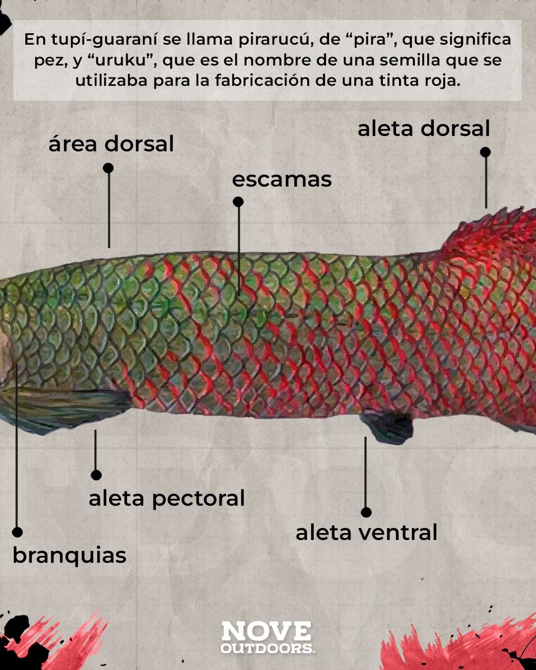 En tupí-guaraní se llama pirarucú, de “pira”, que significa pez, y “uruku”, que es el nombre dado a unas semillas que se utilizaban para la fabricación de una tinta roja.
