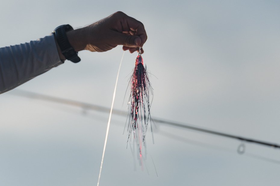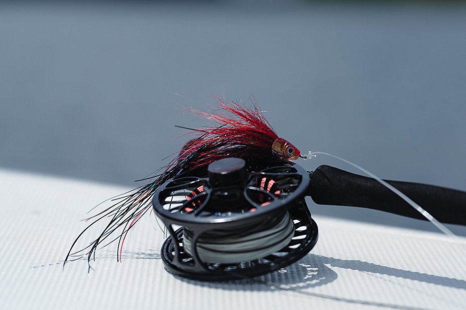 Atamos nuestras moscas con anzuelos 5/0 y 6/0, tratando de que fuesen los más fuertes posibles, porque estos gigantescos peces, con su fuerza, son capaces de abrirlos.
